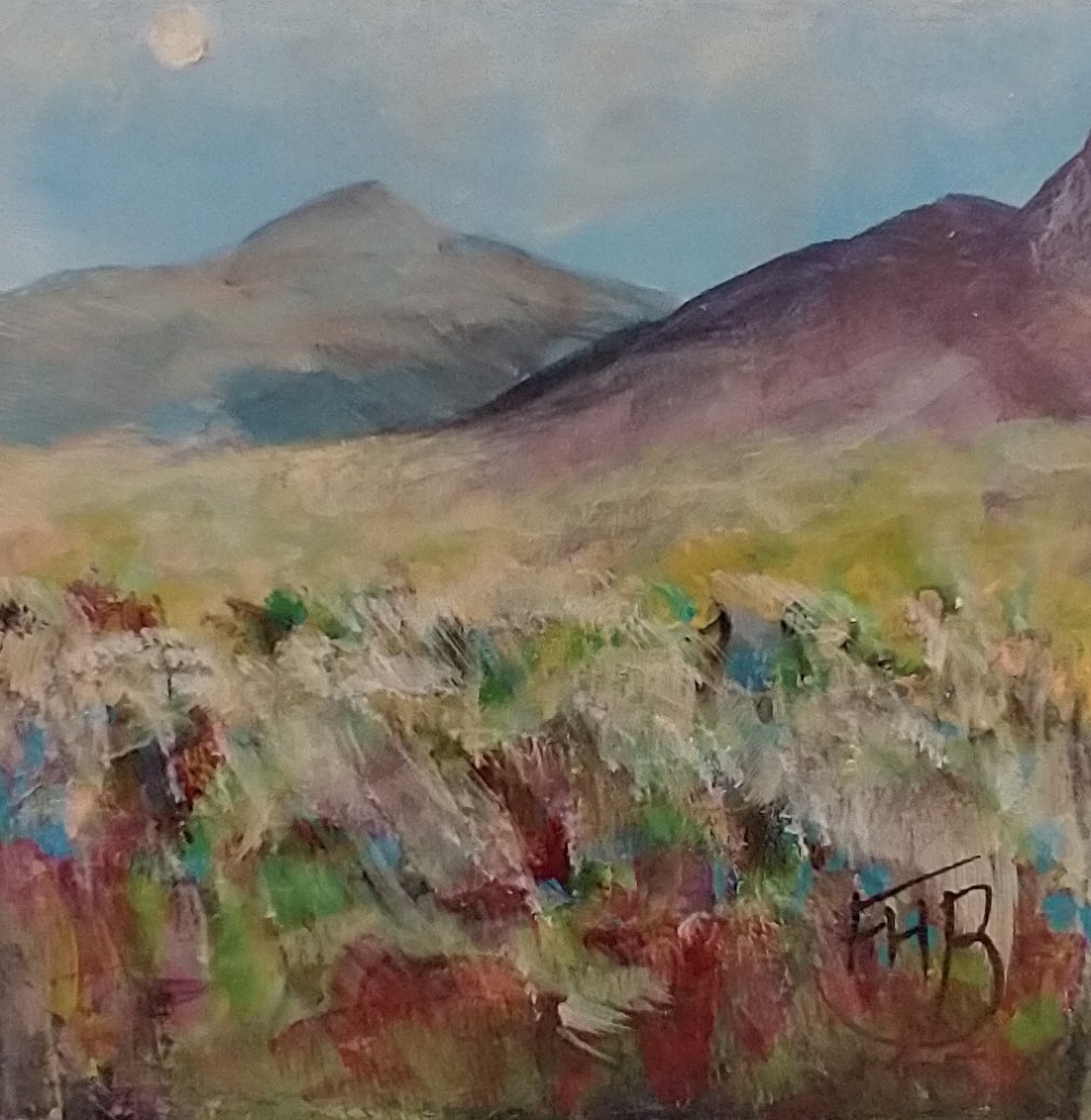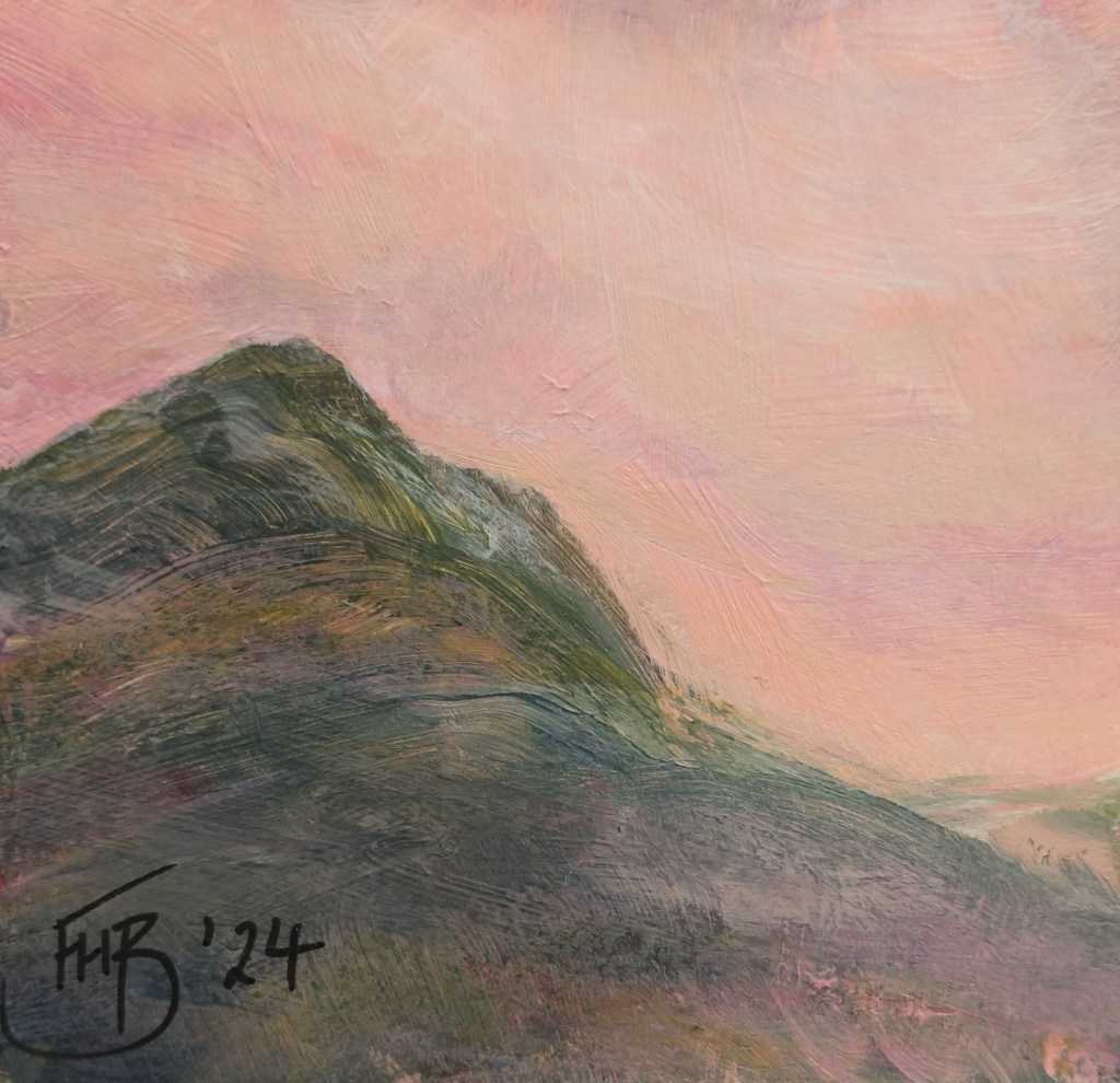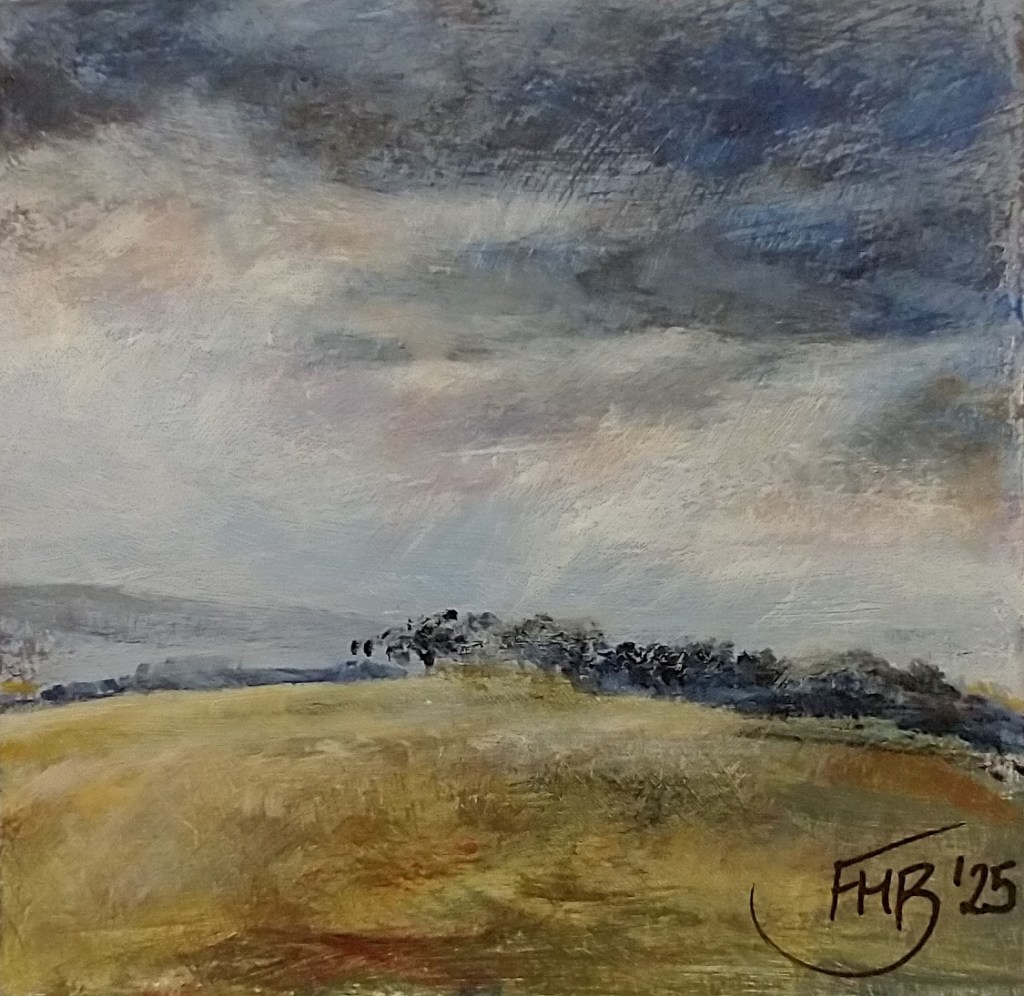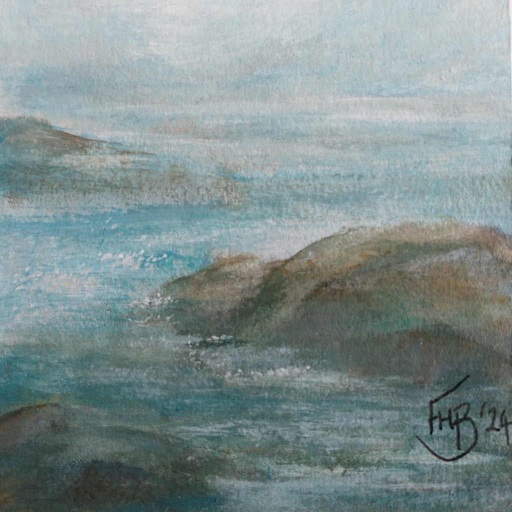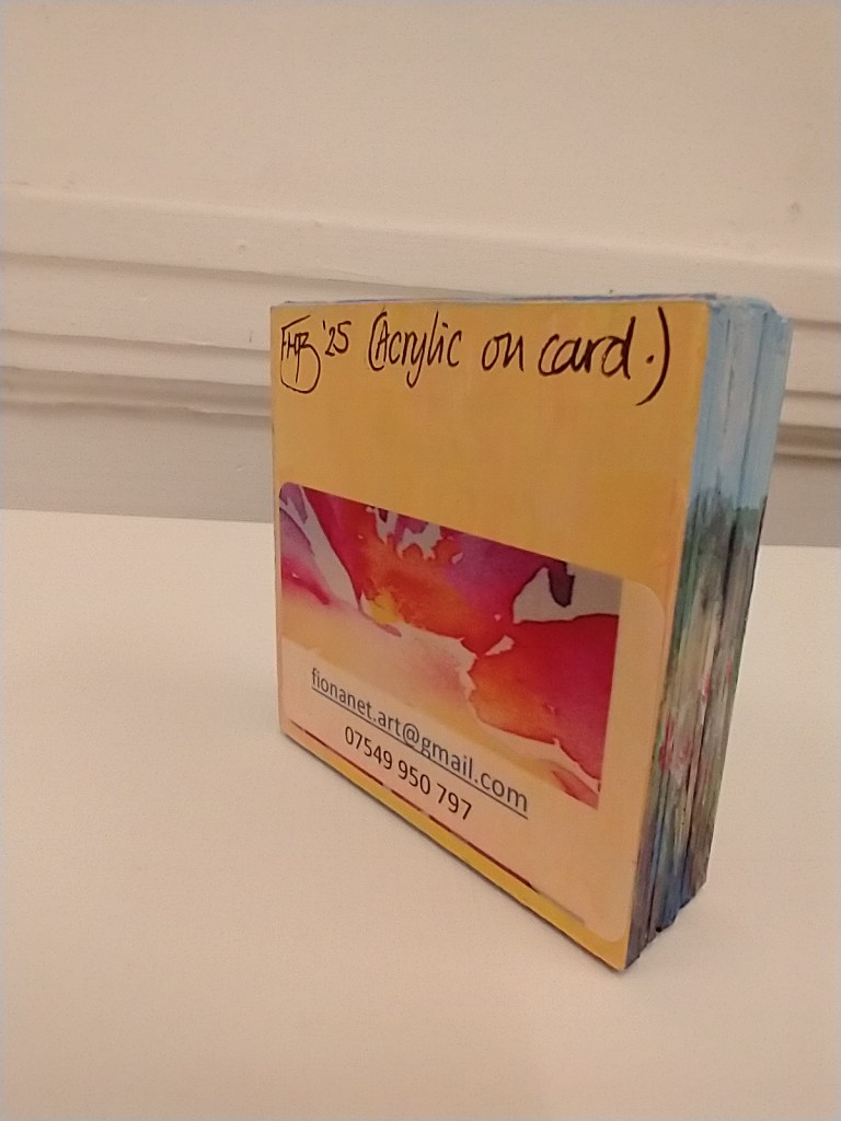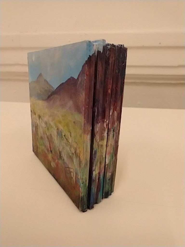 I have measured and hand cut mount card, mostly using offcuts and odd pieces, layered them up into tiny free-standing blocks and painted each with a completely original acrylic painting. Some are of places that I have seen and loved while some are purely imaginative.